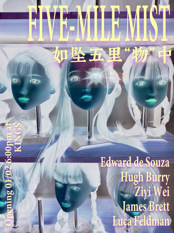 Five-Mile Mist 如坠五里物中 is an exhibition with an aversion to material, digital, and architectural objects. It explores the impact of the rapid churn of objects on the human psyche. The works exhibited are acts of resistance — manipulating dystopian imagery; rhythmic ambience; fetishist dilemmas; satirical undertones and mass-produced items. The works detach, agitate and confuse allowing the viewer to reposition themselves within a society indoctrinated by objects.